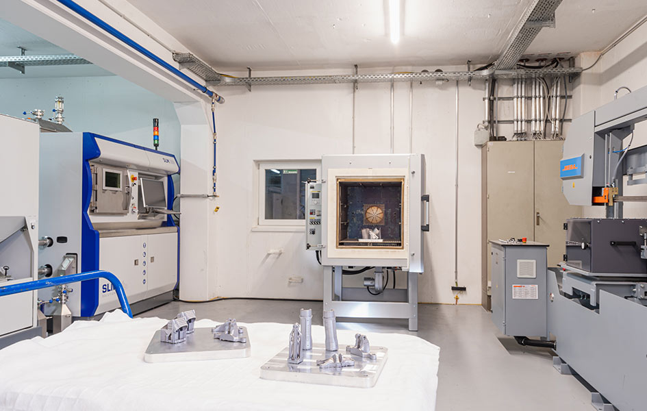 Herstellung von Teilen mittels eines SLM 280 3D Metalldruckers, inkl. Wärmebehandlung in inerter Schutzatmosphäre in einem Nabertherm Ofen.